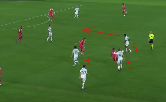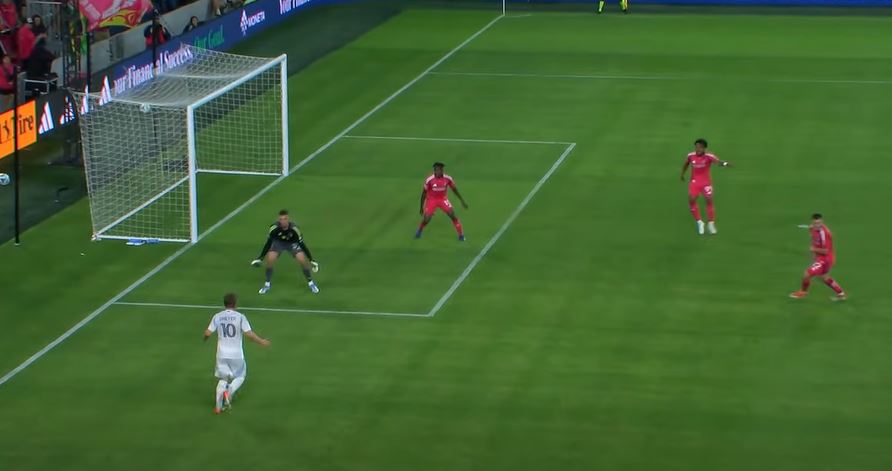 Notice how Dreyer put his hands up just for a second as to indicate that he is looking for a teammate to pass to when in reality he was set on shooting the whole time. This sneaky gesture made Lundt believe he is looking to pass across the box, which gave Dreyer the slightest of margins to strike a well-placed shot into the near corner.
