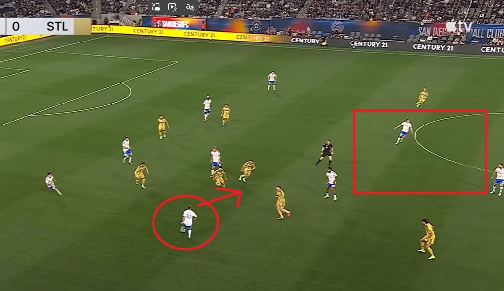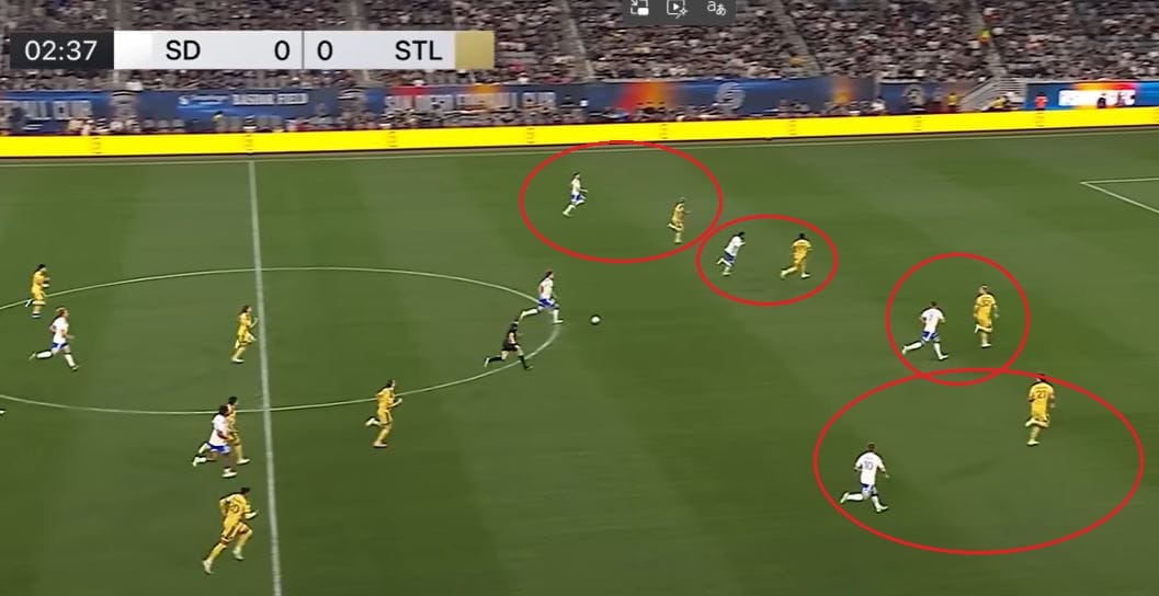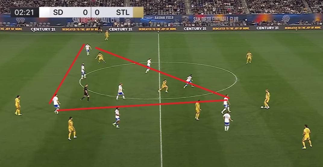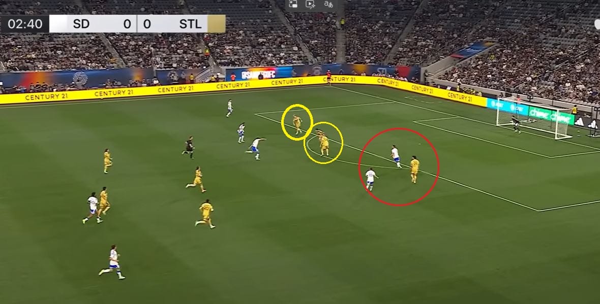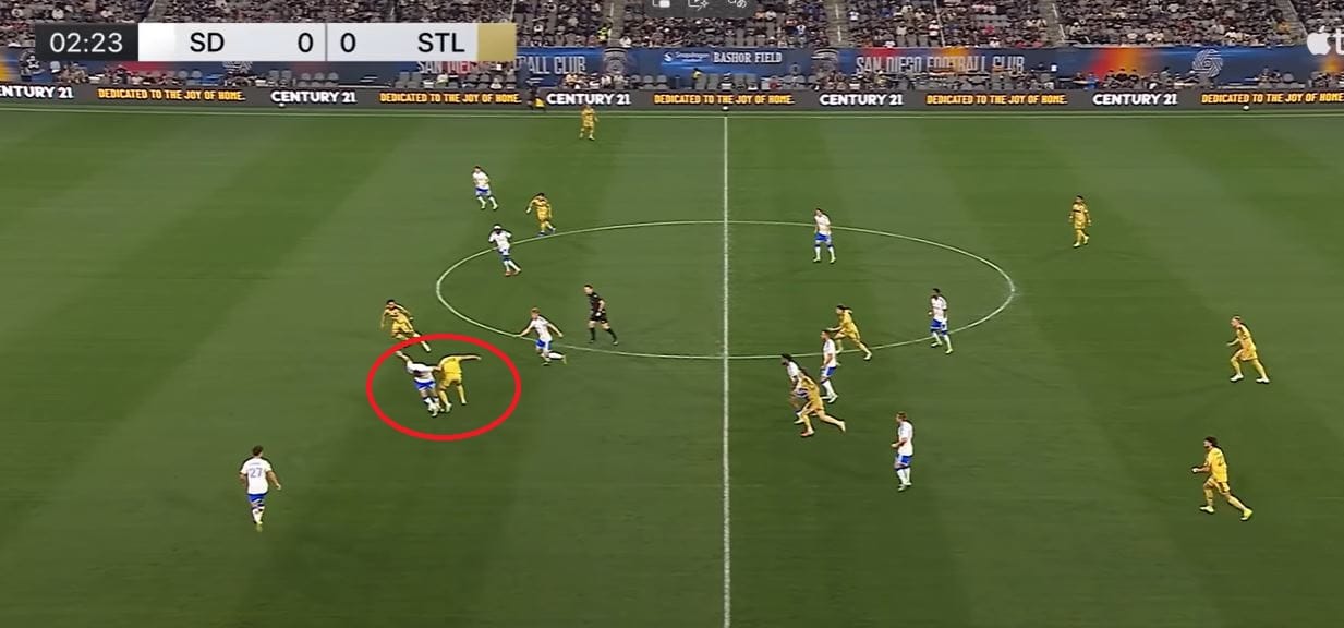 When SDFC keeps the ball, the opposing teams press. San Diego made an example out of Montreal in what happens when the opposing team is not successful in the press – it resulted in a 5-0 win for the home side. Last Sunday, St. Louis City did the same. Let's dive in and analyze a masterclass of how to draw out defenders and capitalize on the created space.