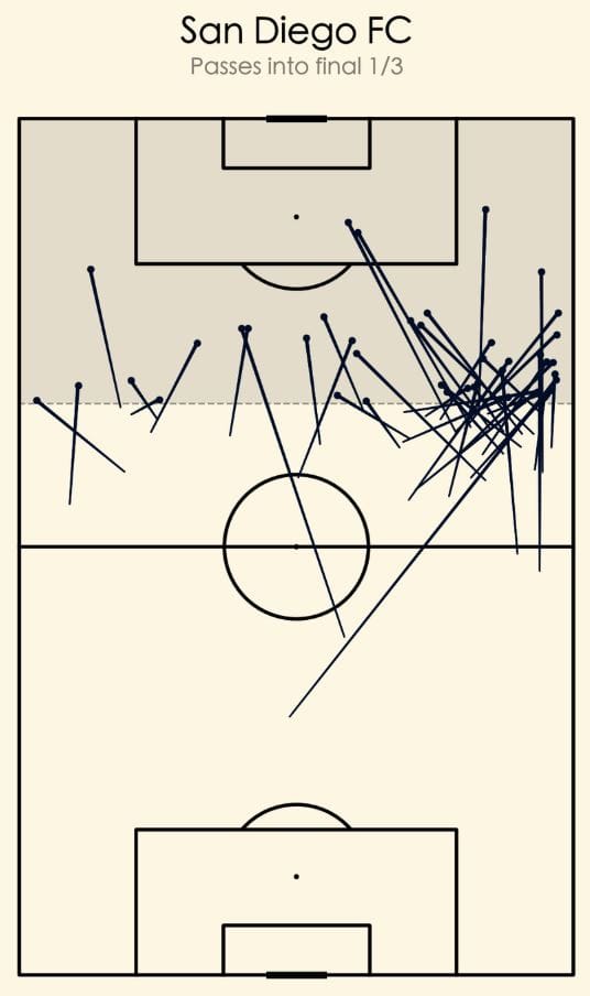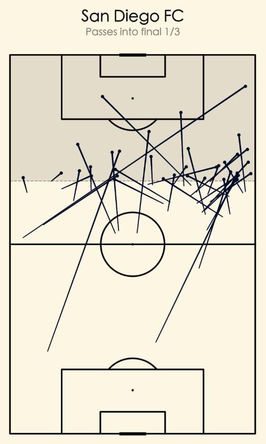 SDFC's passing map in the final 1/3. (Left) vs Montreal & (Right) vs STL