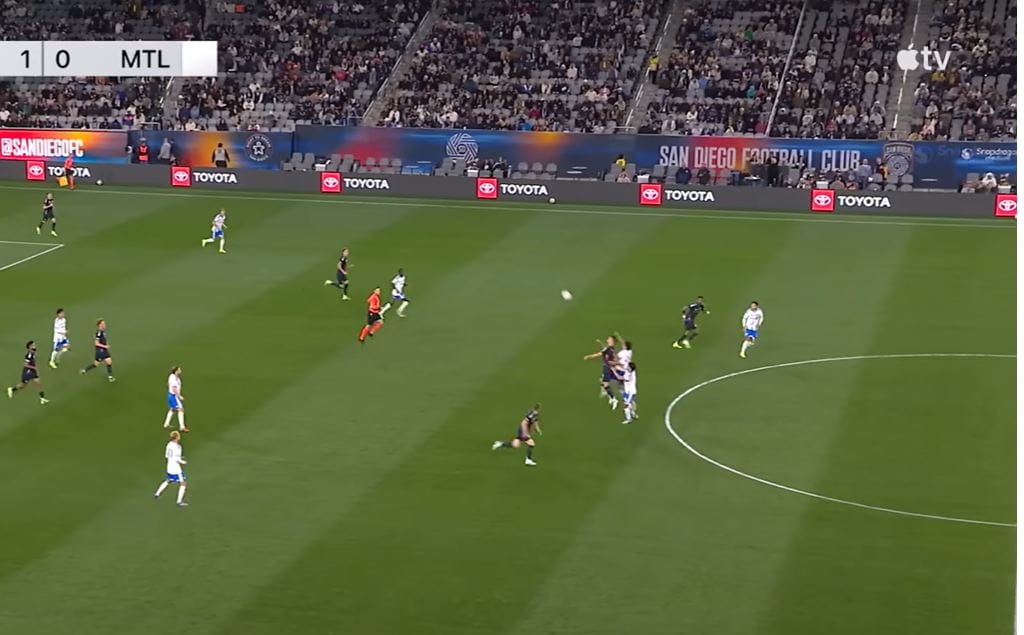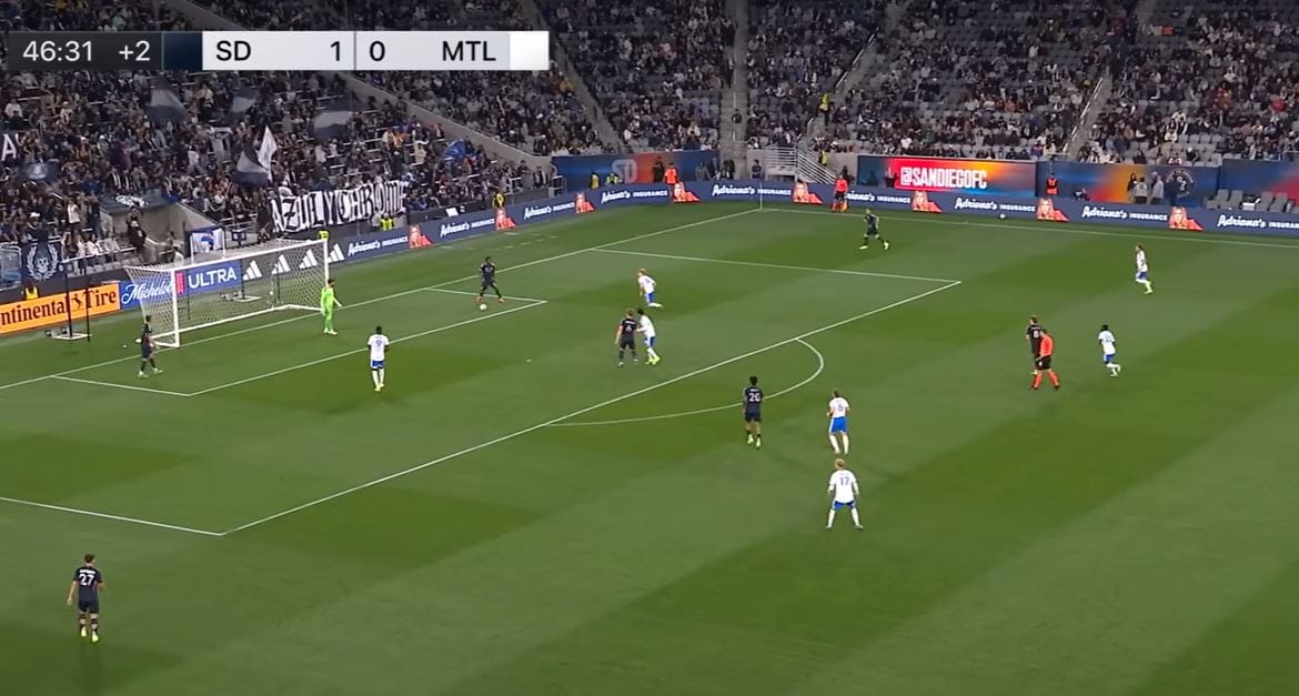 CF Montreal, desperate for an answer after giving up an opening goal inside the first 15 minutes, pressed hard as the first half was coming to an end. Recognizing the press, Manu Duah used his elite field vision to seek out Marcus Ingvartsen with a long pass. Notice how there are seven white shirts all battling to regain possession of the ball in San Diego's half.