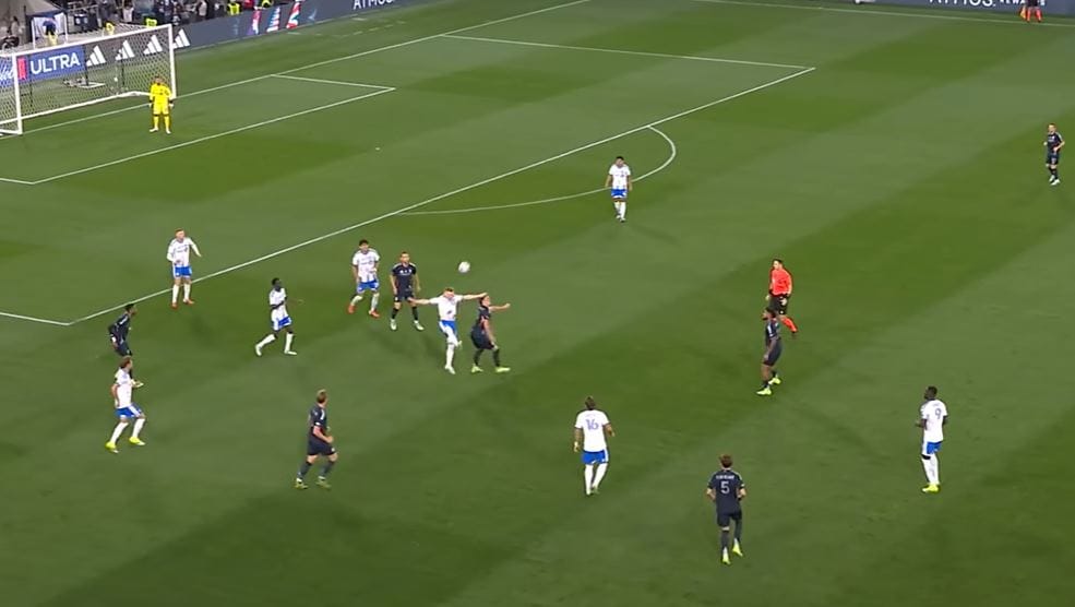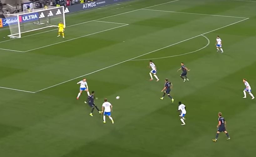 Ingvartsen, standing at 6'1, is known for his abilities in the air. As two Montreal defenders challenge him for the long ball sent in by Duah, Ingvartsen wins the battle and sends Anders Dreyer in on goal with a headed pass. Due to the massive high press that Montreal played, Dreyer had a whole half of space to himself.