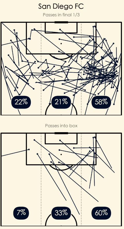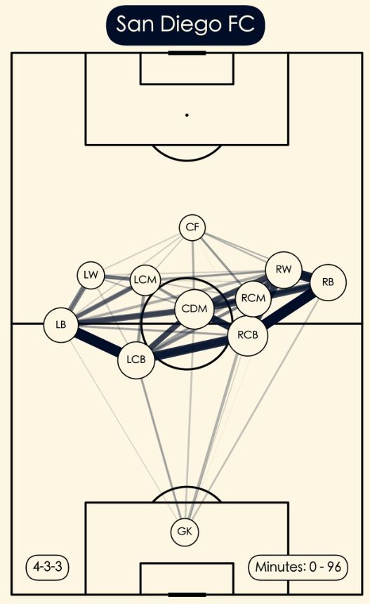San Diego FC played wider and higher than usual in the game against Minnesota, stretching the defense and attacking the flanks. They utilized the right side of the attack close to 60% of time, playing through Dreyer and Verhoeven. This proved costly as Minnesota were forced to play wide and gave up space in their defensive end for the SDFC attackers to run into.