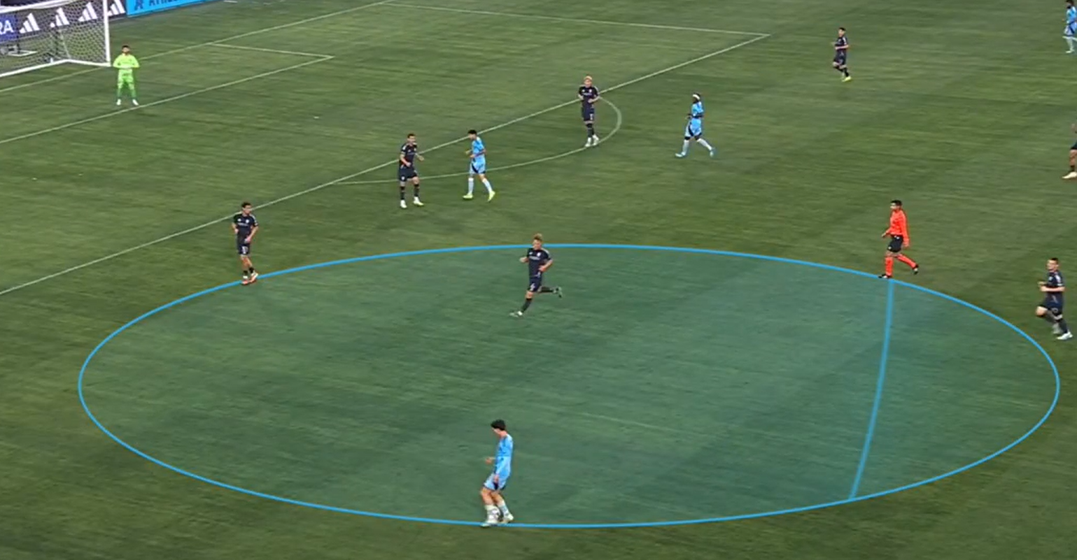 The ball is switched to the other side of the field and the MNUFC player is once again in space without anyone closing him down with urgency.