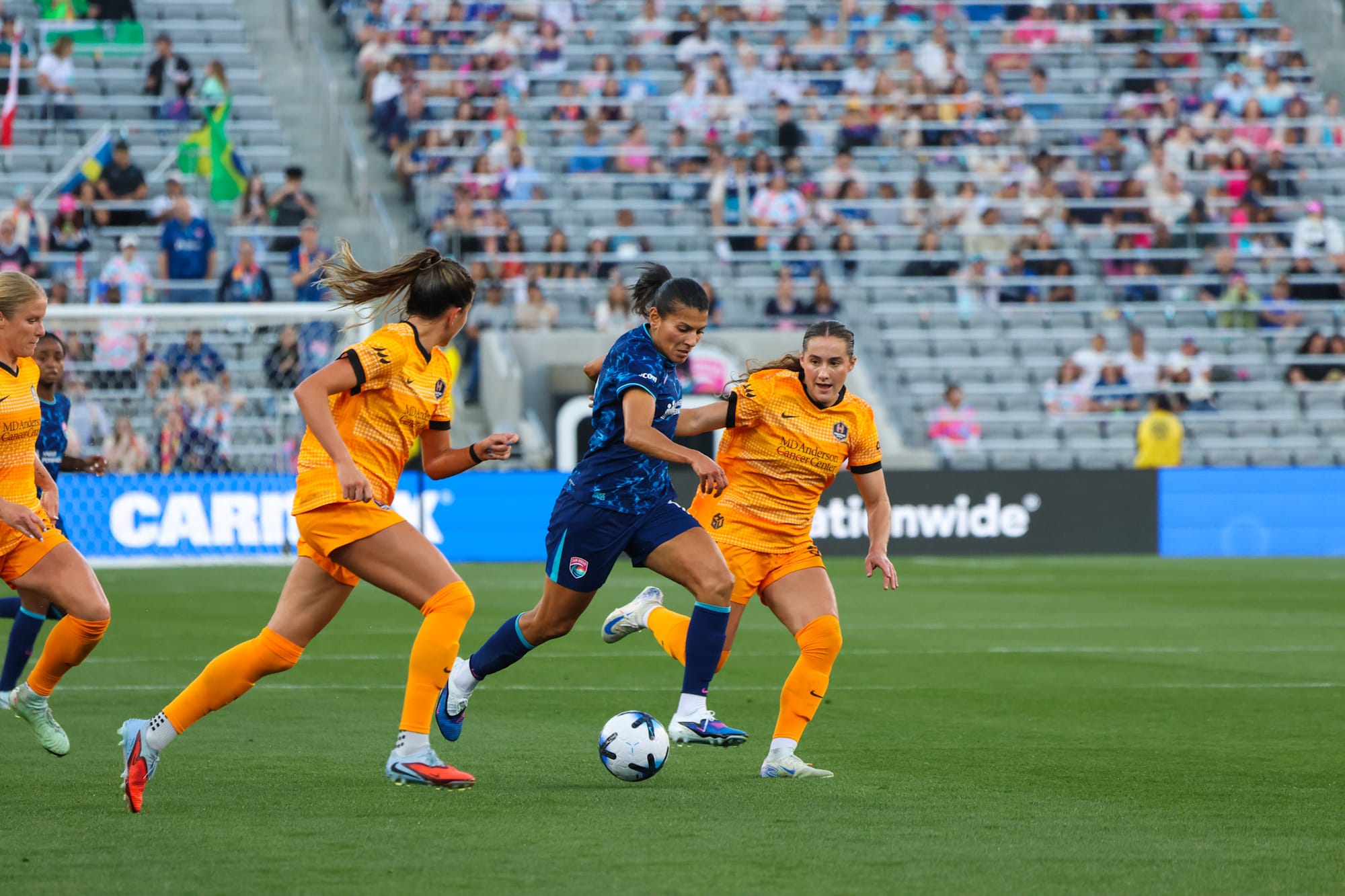 Kenza Dali helped orchestrate the unraveling of Houston’s midfield, weaving her own paths through the pitch. At the 37th minute, she launched a long ball to Dudinha, who just got the angle wrong on her shot, missing the target by inches.